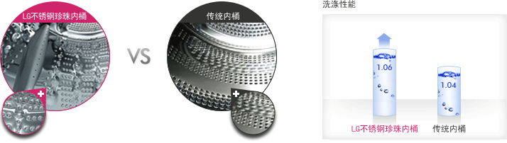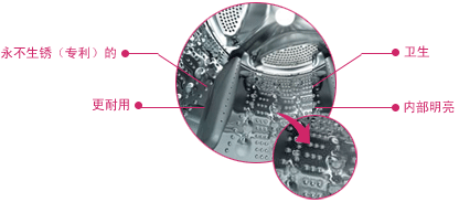 永不生銹(專(zhuān)利)的不銹鋼洗衣滾筒 采用專(zhuān)利的不銹鋼材質(zhì)的滾筒,能保證衣物不受銹漬污染。傳統(tǒng)的油漆涂層桶長(zhǎng)時(shí)間使用后漆層容易脫落,與此不同,LG的耐磨不銹鋼內(nèi)桶非常經(jīng)久耐用。
