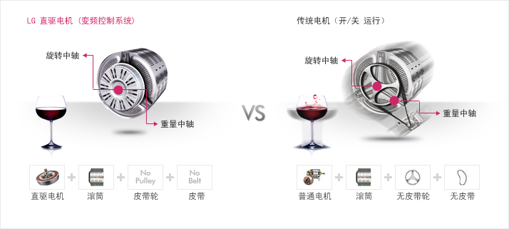 LG變頻直驅(qū)電機(jī)的好處 統(tǒng)一旋轉(zhuǎn)和重量中心:電機(jī)直接作用于滾桶中心 - 增加穩(wěn)定性,震動(dòng)最小化 - 減少噪音-無(wú)皮帶摩擦噪音 減少機(jī)器零件數(shù)量-皮帶和皮帶輪被去除 - 增加耐用性-不磨損