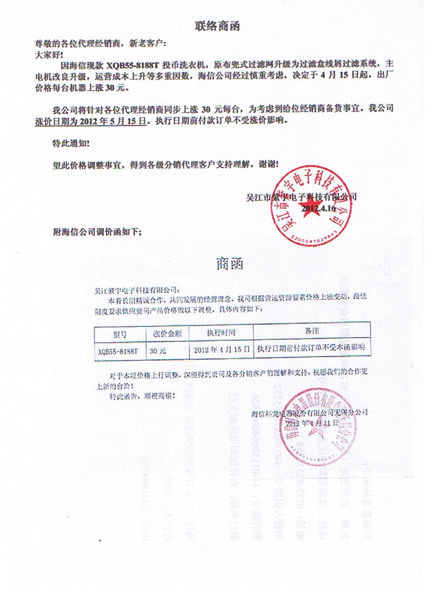 我公司將針對各位代理經(jīng)銷商同步上漲30元每臺,為考慮到給位經(jīng)銷商備貨事宜。我公司漲價日期為2012515執(zhí)行日期前付款訂單不受漲價影響。